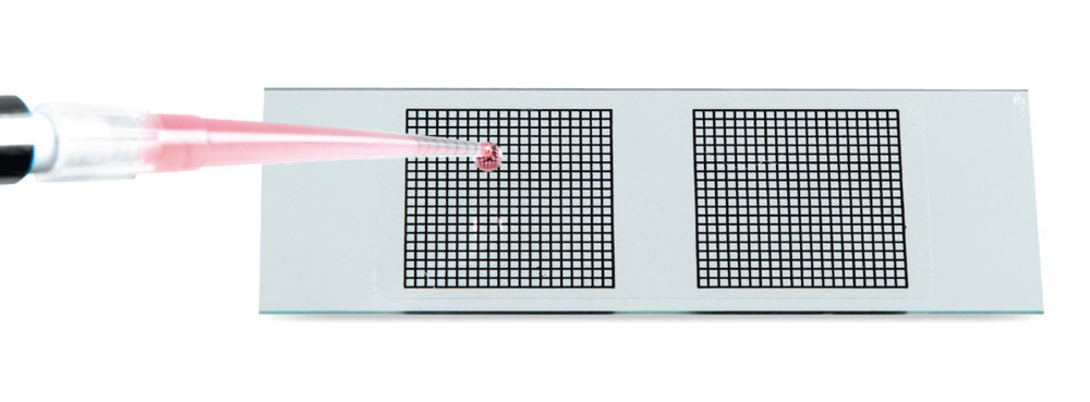 Markierungsfolie für Schienen 2 Gitter 20 x 20 mm Polyester. Zur mikroskopischen Untersuchung oder zum Zählen von Zellkulturen, Hefen, Bakterien und anderen Proben. Kerben und Roste können auch in Kombination verwendet werden. Ausschnitte werden durch Vertiefungen im Folienträger hergestellt. ➁ Mit 2 Rastern 20 x 20 mm, Leitungsabstand je 1 mm