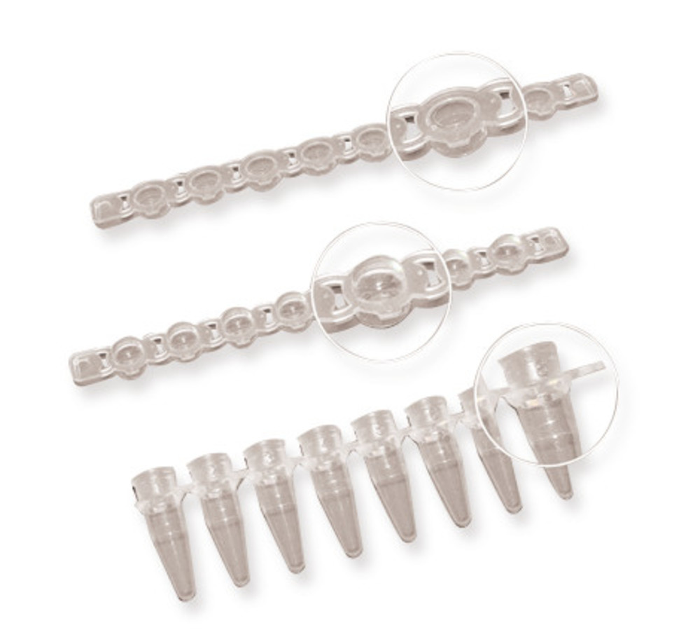 Barriles PCR 8 tiras + 8 tiras de tapa, curvadas de PP. Incoloras. Espesores de pared extra delgados y uniformes, para una transferencia de calor óptima y tiempos de ciclo cortos Plásticos puros de alta calidad sin aditivos Producción en condiciones de sala limpia de acuerdo con ISO 14 644-1 clase 5, 7 y 8 De acuerdo con ISO 14 644-1 Clase 5 a 8 DNasa, ADN y RNasa sin Apto para todos los termocicladores comunes Las tapas se pueden abrir y cerrar fácilmente Autoclavables a 121 ° C (2 bar), de acuerdo con DIN EN 285 Depósitos con tapas planas adecuadas para la PCR en tiempo real adecuados ➀ recipientes de PCR sueltos con tapa colgante Tapa abovedada o plana con sellado confiable, la pérdida de líquido debido a la evaporación se mantiene al mínimo. ➁ Tiras de barril de PCR de 8 con tira de tapa adjunta Tapa de bola. ➂ Tiras de tambores PCR de 8 con tapas sueltas adjuntas Tapas sueltas planas para una protección óptima contra la contaminación. ➃ Tiras de barril de PCR de 8 con tira de tapa separada Barriles en el extremo con labio. Tiras de tapa con tapa curva o plana y un pequeño labio en el costado de cada tapa para una apertura cuidadosa y libre de contaminación.