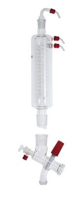 Condenseur vertical avec distributeur et vanne d'arrêt pour distillation à reflux. Le solvant à distiller peut être introduit en continu par le tube d'entrée en PTFE. Condenseur et ballon de réception revêtus pour une protection contre les éclats.