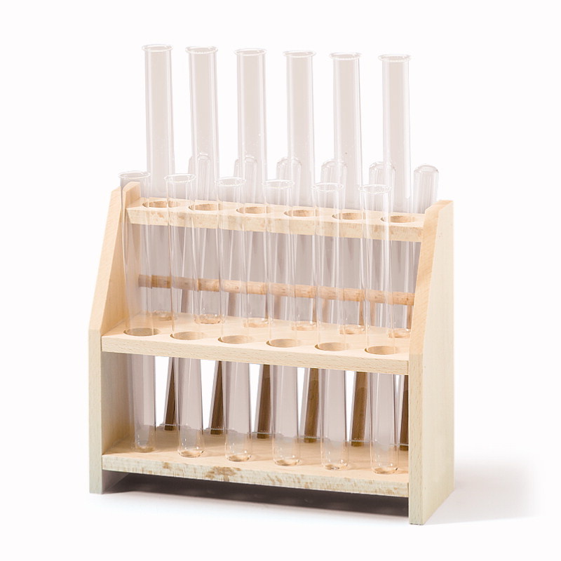 Legno di faggio, laccato. Per provette con un'altezza minima di 100 mm (cod. ordine AEE3.1 per provette con un'altezza minima 160 mm). Opzionalmente con posizioni di gocciolamento per asciugare le provette dopo la pulizia.